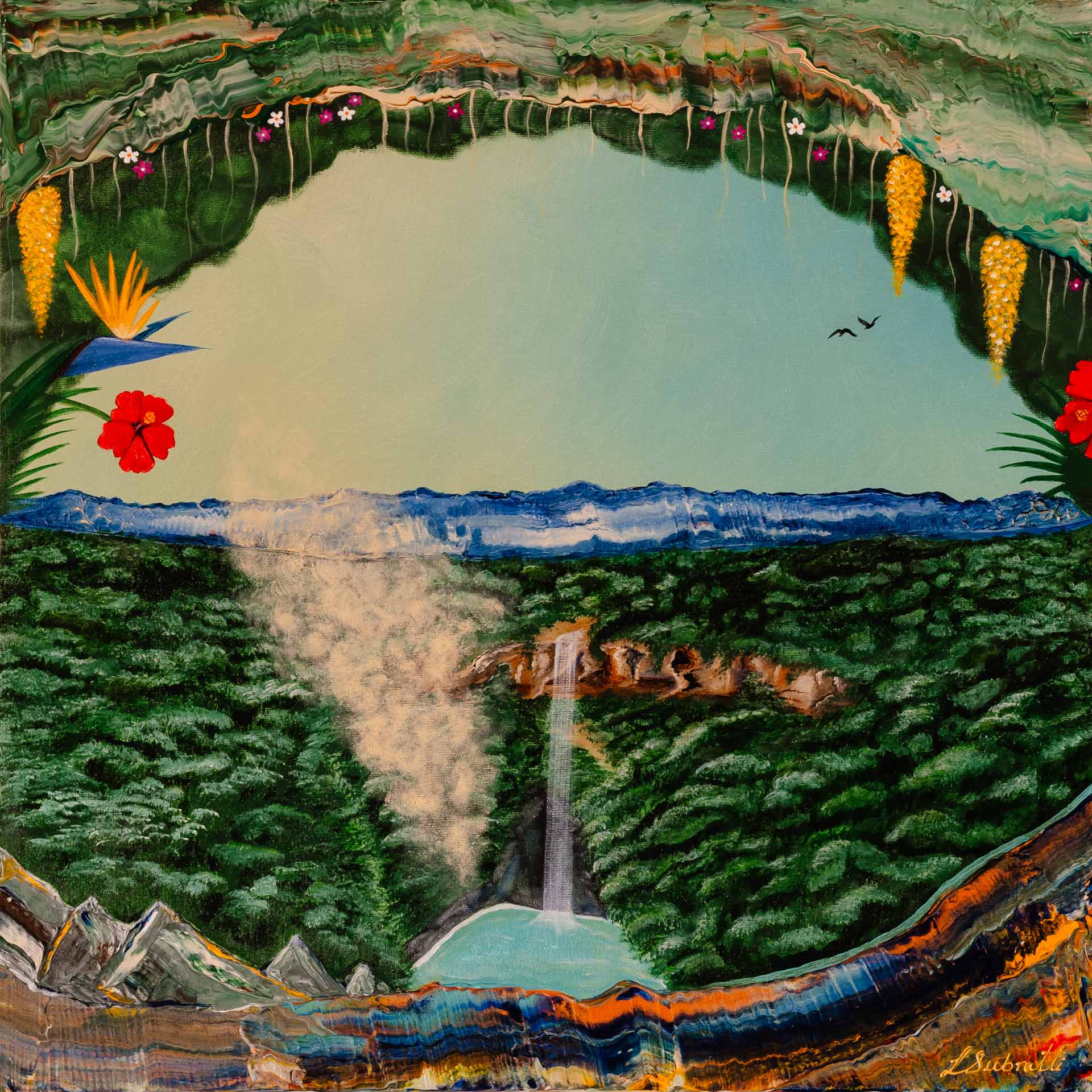 From her enchanting signature collection “A Sanctuary Through a Lens, Tamarind Falls, Mauritius” immerses you in the lush, tropical paradise island of Mauritius.  This vibrant artwork captures the cascading Chamarel waterfalls amid verdant greenery, framed by exotic Hibiscus and Birds of Paradise flowers.  The serene blue sky and the vibrant colours of the surrealistic dunes of Chamarel – Seven Coloured Earths adds warmth and intrigue.  This artwork presents the breath taking beauty and vibrancy of Mauritius as if looking through a lens.  Ideal for nature lovers, this piece brings the tranquillity and beauty of a hidden sanctuary into your home.