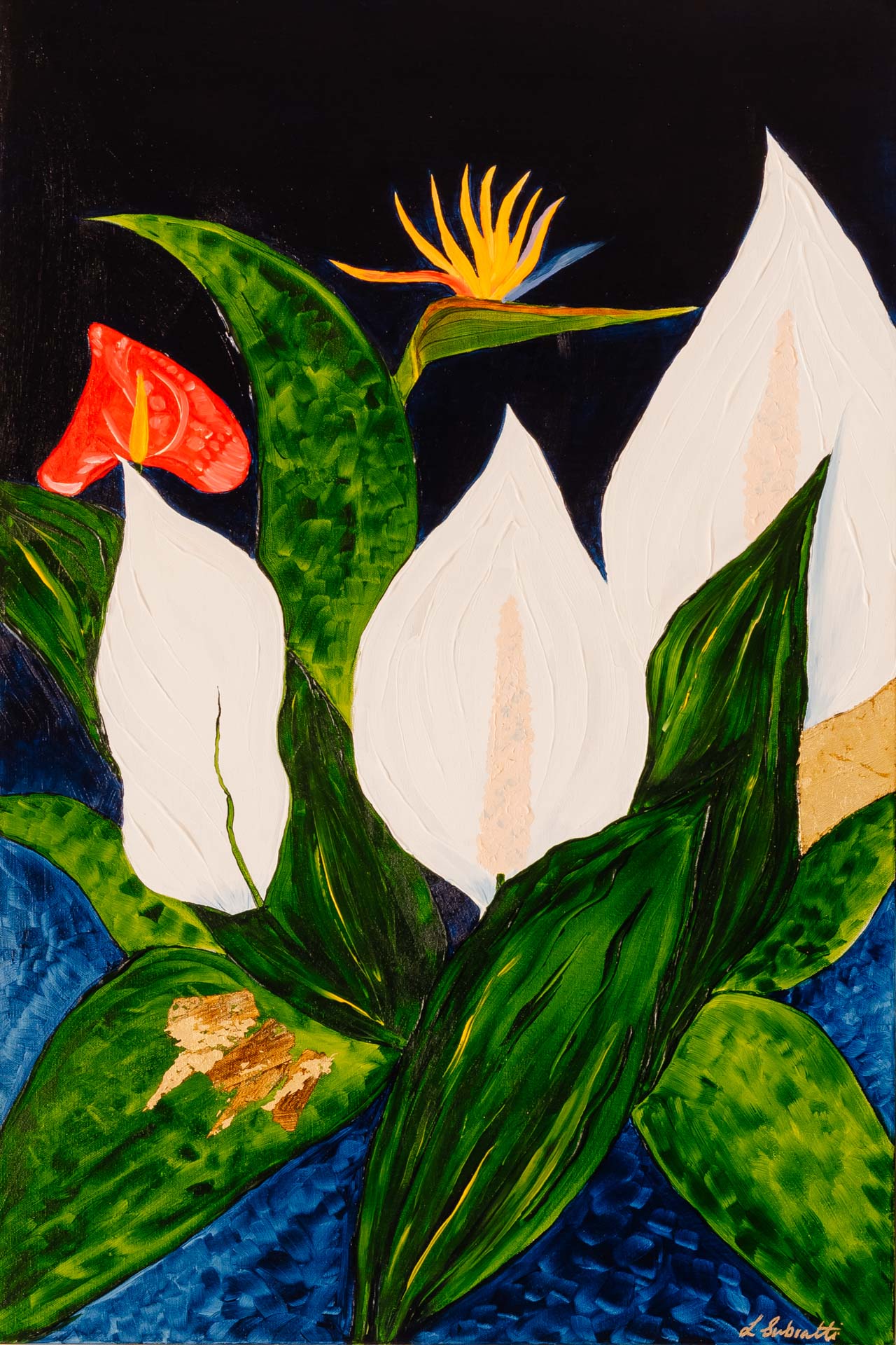 “Dancing White Lilies” is a vibrant celebration of nature’s elegance, featuring graceful white lilies contrasted against deep greens and rich Prussian blues. The addition of the warming colours of the Anthurium and Bird of Paradise flowers adds a striking balance, creating a lively, yet serene composition. Perfect for those who love bold floral art with a touch of modern flair.