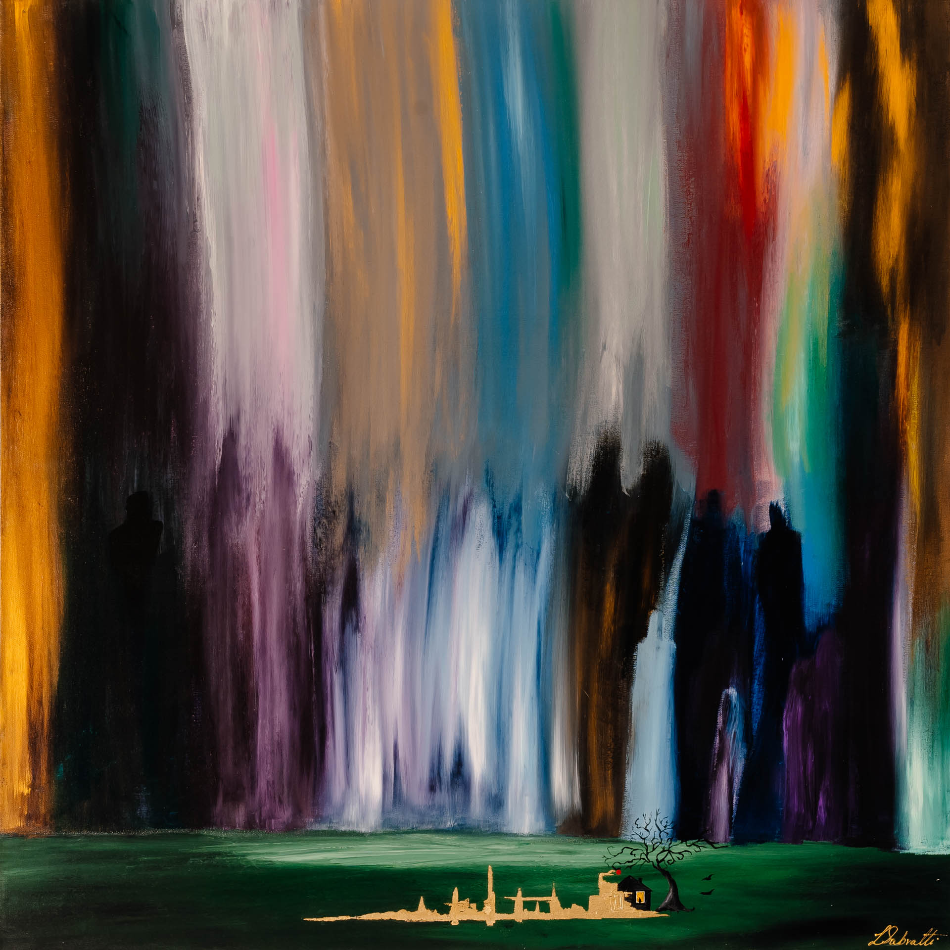 “Ethereal Spirits” is a mesmerizing piece that juxtaposes a vibrant cascade of colours. The interplay of light and shadow creates a haunting yet beautiful scene, evoking a sense of mystery and otherworldly presence overlooking and dominating the gold city landscape. Sitting at its base, a haunting tree bearing fruit to the city, the solitary house with the person in the window denotes an air of mystery and symbolism. This artwork is perfect for those who appreciate the surreal and the profound, making a bold statement in any space.